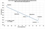 Laut Düngeverordnung darf Hartweizen (Sommer- und Winterform) bei einem Ertrag von 55 dt/ha mit 200 kg N/ha (abzüglich NMin) gedüngt werden. Einzelne Bundesländer erlauben in ihrer Landesdüngeverordnung explizit bei Winterdurum bei einem Ertrag von 80 dt/ha bis zu 260 kg N/ha (abzüglich NMin). Doch wieviel Unterschied im RP-Gehalt liegt zwischen den verschiedenen Sorten und wie ist dabei der Verdünnungseffekt durch höhere Kornerträge zu berücksichtigen? Die Düngung ist in einem Landessortenversuch für alle Sorten an einem Standort des jeweiligen Jahres einheitlich. In einer Auswertung wurden hierzu von 2016 bis 2021 die Sorten Wintergold, Diadur, Limbodur, Sambadur, Saaledur und Winterstern in den Anbaugebieten Ost und Südwest miteinander vergleichen. Beim Kornertrag mehrjährig liegt zwischen den Sorten mit dem geringsten und höchsten Ertrag je nach Anbaugebiet ein Unterschied von 9,5 dt/ha (Ost) und 7,5 dt/ha (Südwest). Beim RP-Gehalt im Korn beträgt dieser Unterschied in beiden Anbaugebieten etwa 1,3 % zwischen der Sorte mit dem geringsten und höchsten RP-Gehalt, wobei sich die absolute Höhe im RP-Gehalt zwischen den beiden Anbaugebieten unterscheidet. Mit Kornertrag und RP-Gehalt lassen sich nun Aussagen zur Grain-Protein-Deviation (GPD) als Maßstab für die Proteinsicherheit in Abhängigkeit des Ertragsniveaus darstellen. So zeigen die Sorten Saaledur, Winterstern und Sambadur eine Vorzüglichkeit in Bezug auf den RP-Gehalt mit zunehmendem Kornertrag. Das heißt der Verdünnungseffekt im RP-Gehalt ist bei diesen drei Sorten mit zunehmendem Kornertrag nicht so hoch, wie bei Wintergold, Diadur und Limbodur (vgl. Abb. 1 und Abb. 2).