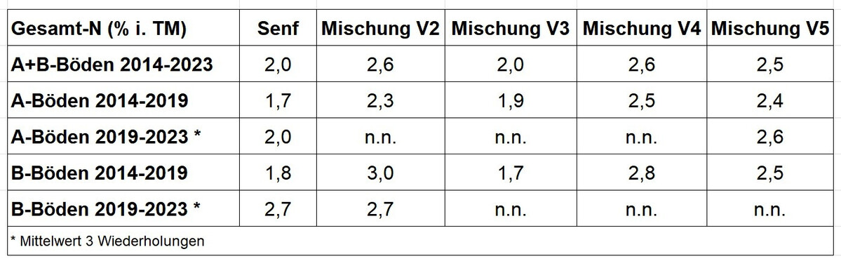 Die Veränderung der Stickstoffgehalte über die in Tabelle 1 dargestellten Zeiträume zeigt sich besonders beim Senf und weist auf ein steigendes Stickstoffangebot des Bodens durch klimatisch bedingte Mineralisation hin. Die Stickstoffgehalte im Aufwuchs der Zwischenfrüchte ohne Leguminosen sind während des gesamten Versuchszeitraumes unabhängig vom Trockenmasseertrag angestiegen. Die Zwischenfruchtmischungen V2, V4 und V5 waren durch den Leguminosenanteil immer schon in der Lage, den Stickstoffbedarf unabhängig vom Angebot des Bodens zu generieren.