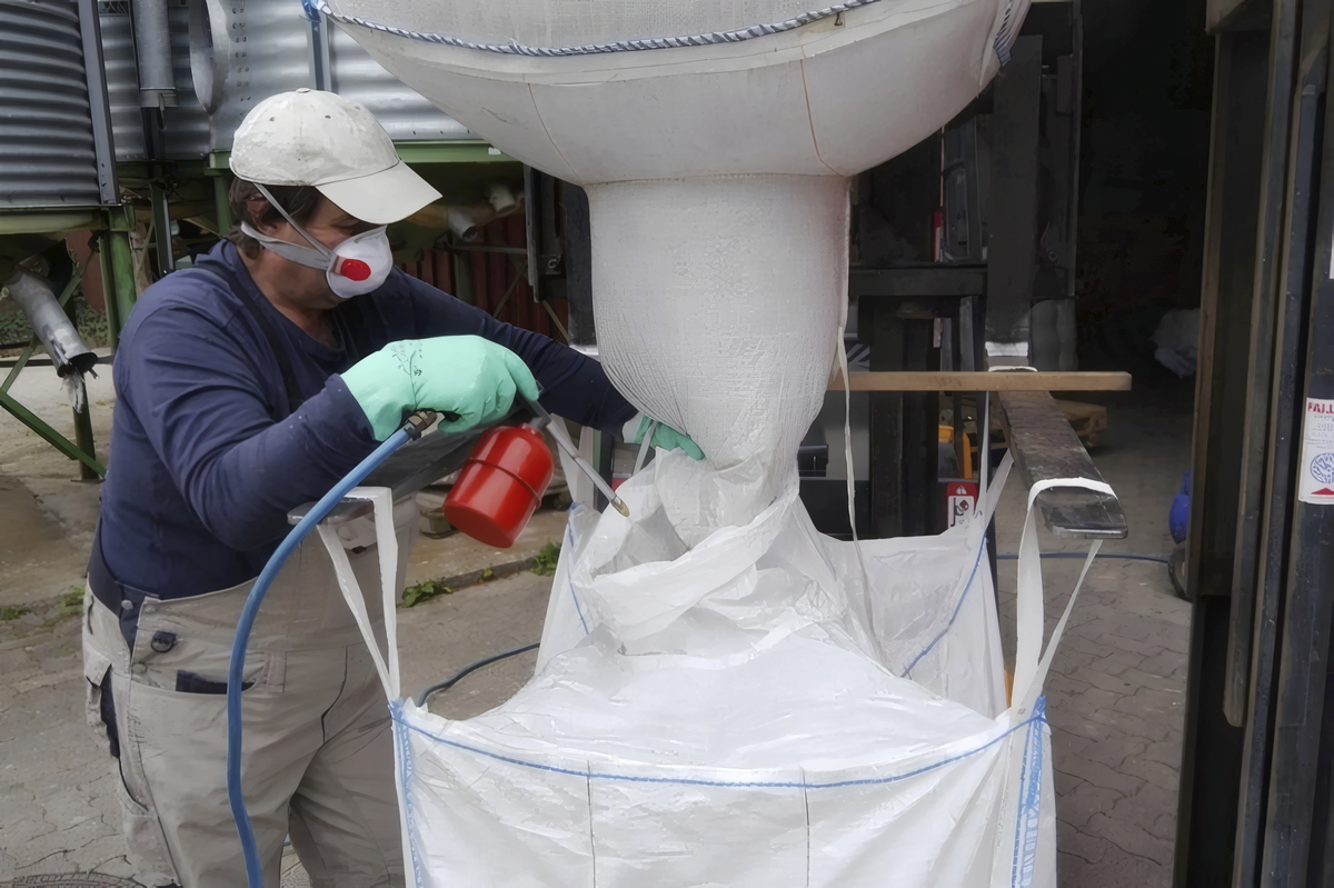 Flüssige Impfmittel lassen sich insbesondere bei größeren Saatgutmengen leichter handhaben. Eine Impfung im Betonmischer ist auch hier eine Option, erfordert jedoch Vorsicht. Praktischer ist es, das Impfmittel mit einer Sprühpistole aufzubringen, während das Saatgut von einem Big Bag in einen anderen runterläuft. Dieser Vorgang sollte 3- bis 4-mal wiederholt werden, um eine gute Verteilung zu gewährleisten. Alternativ kann man das Saatgut auch auf Förderbändern umlaufen lassen, etwa aus bereits vorhandener Kartoffeltechnik, und das Impfmittel währenddessen aufsprühen.