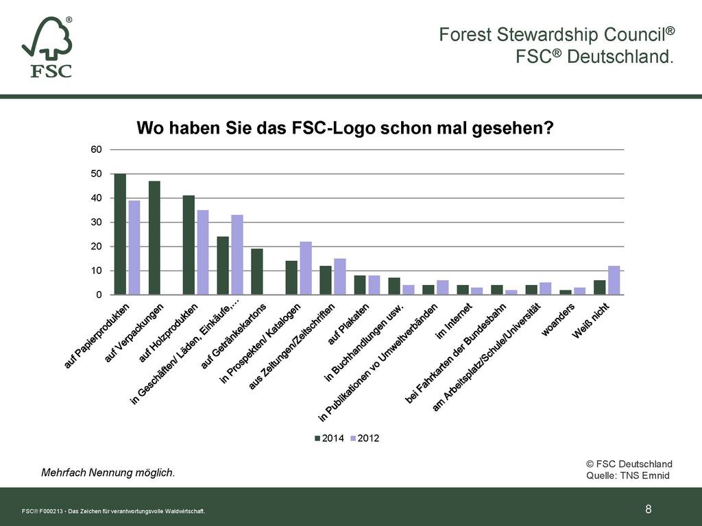 Auf Tischen, Stühlen, Prospekten, Druckerpapier, Bahnfahrkarten, Taschentüchern, Kartons, Verpackungen, Getränkeverpackungen und auf vielen anderen Produkten ist das FSC-Logo heute bereits als verlässliches Zeichen für ein Produkt aus verantwortungsvoll bewirtschafteten Wäldern zu finden. Die in den letzten Jahren steigende Präsenz des FSC-Logos auf unterschiedlichen Produkten sowie ein verstärktes Engagement des FSC in der Öffentlichkeit haben die Bekanntheit des FSC-Zeichens beflügelt.
