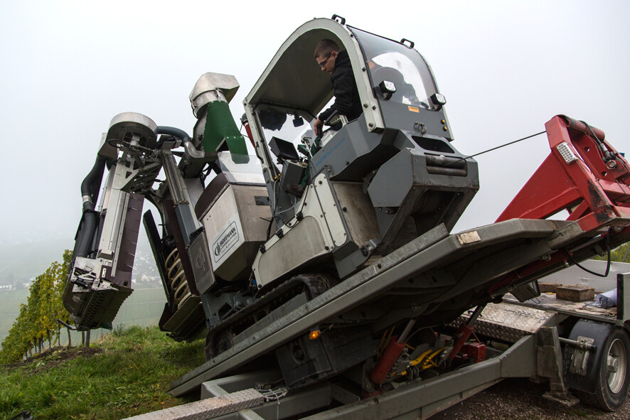 Das Dienstleistungszentrum Ländlicher Raum Mosel und die Carl Hoffmann Landmaschinen Fachbetrieb GmbH Erntetechnik haben die Arbeitsschritte beim Ernten in Steillagen optimiert: Zunächst wird während der Abwärtsfahrt eine Zeile geerntet, dann wird der Vollernter per Seilwinde wieder nach oben auf den Transport- und Sortierhänger gezogen und zur nächsten Zeile gefahren. Direkt im Anschluss an die Ernte einer Zeile werden auf dem Hänger traubeneigene Verunreinigungen (Blätter, Stiele etc.) schonend aussortiert. So kann die Leerzeit, die entsteht während der Hänger zur nächsten Zeile transportiert wird, effektiv genutzt werden.