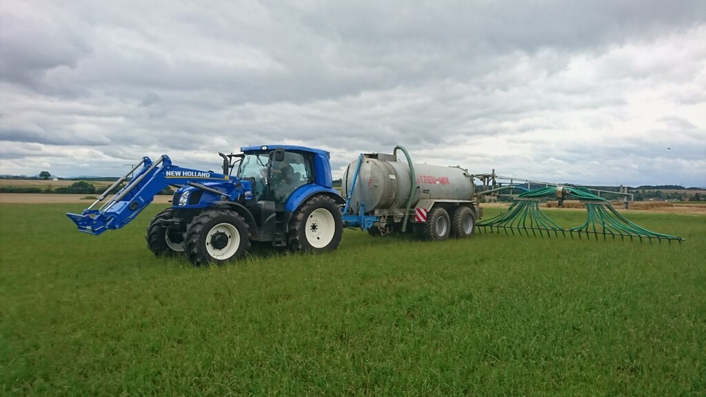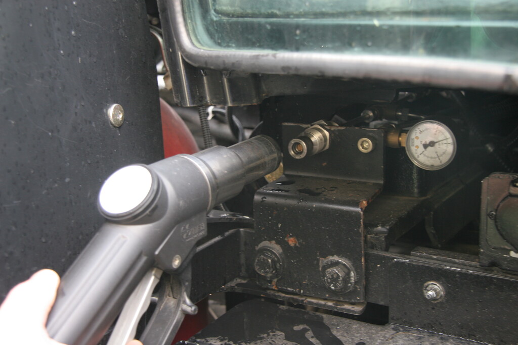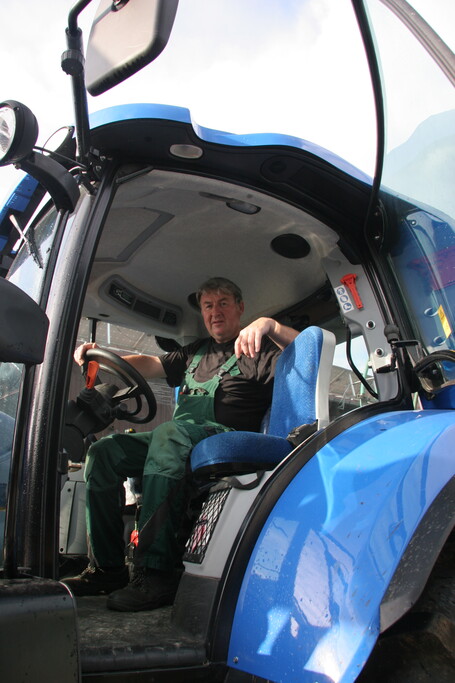 In die neun Gastanks, drei in der Kabinenkonstruktion und sechs an den Seiten, passen 52 Kilo Gas. „Das hat denselben Energiegehalt wie 70 Liter Diesel und reicht für fünf bis sechs Stunden Gülle fahren“, erklärt Winfried Vees. In den vier Wochen Testphase auf seinem Hof hat Vees den Methantraktor überwiegend für diese Arbeit eingesetzt. Da er keine Marktfrüchte anbaut, fallen bei ihm keine Erntearbeiten an. „Der Traktor fährt wie jeder andere, man muss nur etwas hochtouriger fahren“, so seine Erfahrung, „daran gewöhnt man sich schnell“. Für den Dauerbetrieb sollte der Kraftstoff jedoch für einen ganzen Tag reichen. Das System schaltet automatisch auf eine volle Flasche, sobald die aktuelle leer ist, nur die letzte muss man von Hand zuschalten. „Das ist sozusagen die Reserve, dann weiß ich, dass ich nach Hause fahren muss.“ Es gäbe auch die Möglichkeit, Reserveflaschen mitzunehmen, aber dazu braucht man dann auch eine Zapfpistole, und die ist relativ teuer, berichtet Vees.