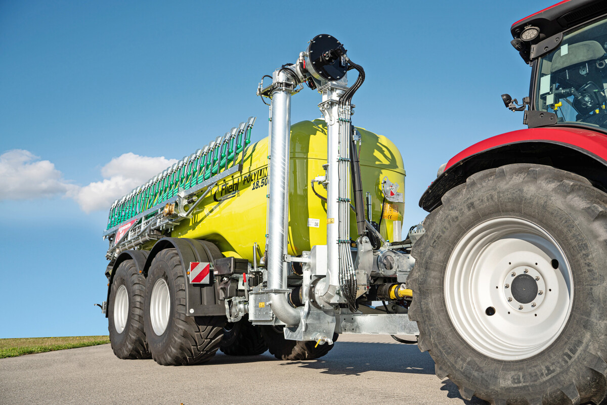 von Redaktion Quelle Fliegl erschienen am 05.01.2026Fliegl Agrartechnik erweitert sein Pumpfass-Portfolio um das PFW Big Foot Poly Line 18.500 mit GFK-Tank. Der niedrige Schwerpunkt des Poly-Line-Fasses biete vor allem beim Einsatz in Hanglagen besondere Vorteile. Ein Merkmal sei auch die bodenschonende Bereifung 800/65 R 32. Das luftgefederte Fahrwerk sorge für Fahrkomfort auf der Straße. Optional sind zudem eine Reifendruckregelanlage und die elektronische Zwangslenkung Steer X erhältlich. Der doppelgelenkte Acht-Zoll-Saugrüssel Elefant erreicht eine Saugtiefe von mindestens 3,5 Metern und wird über einen proportionalen Joystick gesteuert, heißt es von Fliegl. Für eine hohe Förderleistung sorge die mechanisch angetriebene Vogelsang-Drehkolbenpumpe, unterstützt durch den Turbobefüller Pro Fill von Agrar Pro. Optional stehen die Isobus-Steuerung Fliegl Slurry Tanker sowie die Durchflussmengenregelung DMR zur Verfügung. Das Fass kann mit einer Vierpunkthydraulik ausgestattet werden, um zusätzliche Anbaugeräte, wie etwa eine Güllescheibenegge, anzukoppeln.