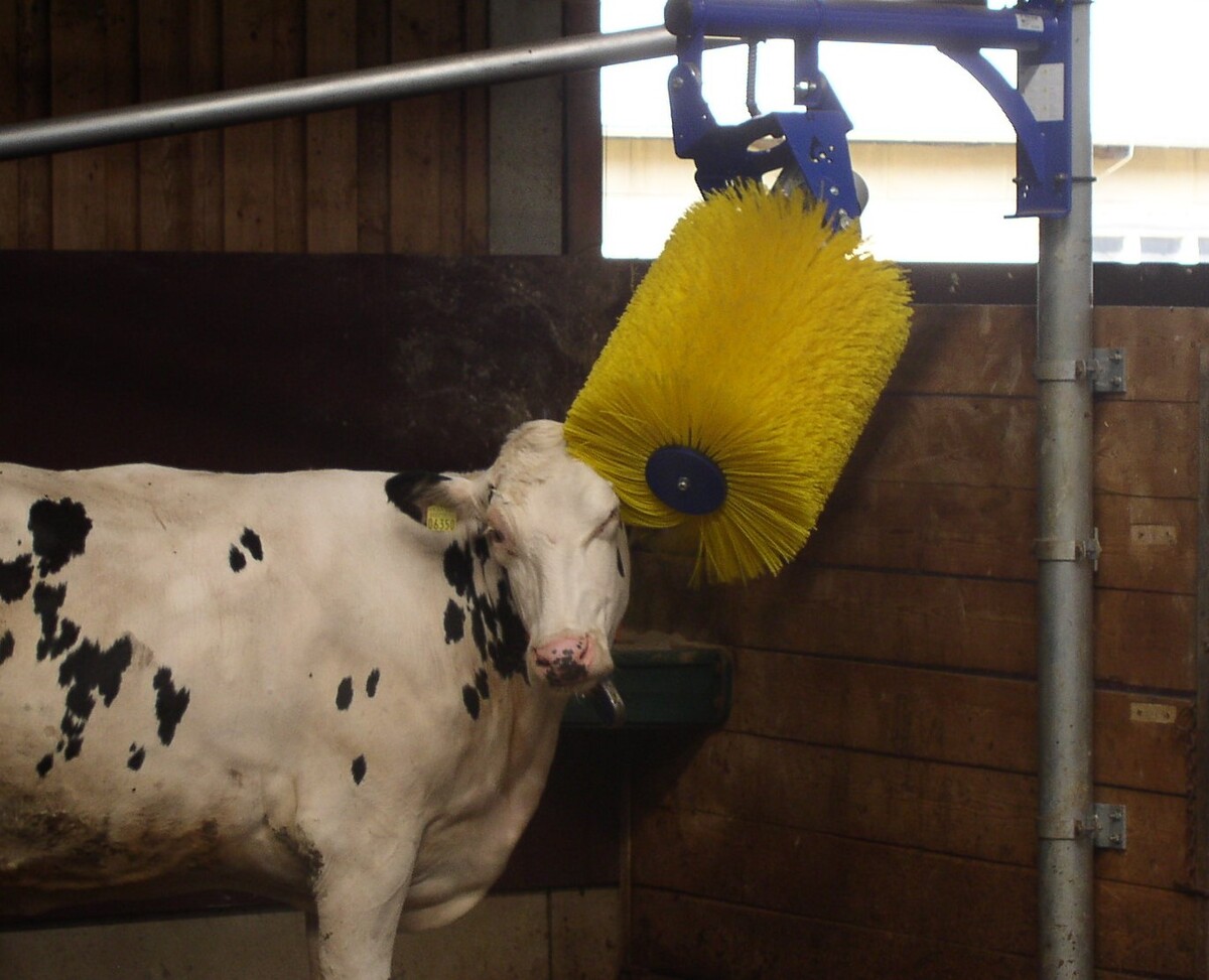 - Sicherheitsrisiken: Neben der erwähnten Standfestigkeit, einem geeigneten Montageuntergrund und der passenden Montagehöhe, sind noch andere Faktoren sicherheitsrelevant: Bei elektrischen Bürsten sollte die Stromzufuhr am besten von oben kommen und vor Tritten und Bissen geschützt sein. Achten Sie bei elektrischen Bürsten außerdem auf eine Überlastsicherung, damit die Tiere sich nicht verletzen, wenn sich beispielsweise der Schwanz aufwickelt. Bei der Überlastsicherung dreht die Bürste in der Regel langsam rückwärts und befreit so den Schwanz. Einige Hersteller empfehlen, zusätzlich den Kühen die Schwanzhaare zu kürzen. Da sich die Tiere erfahrungsgemäß weiter an Trögen und Mauern kratzen werden, sollten scharfe Kanten hier (auch weiterhin) vermieden werden.