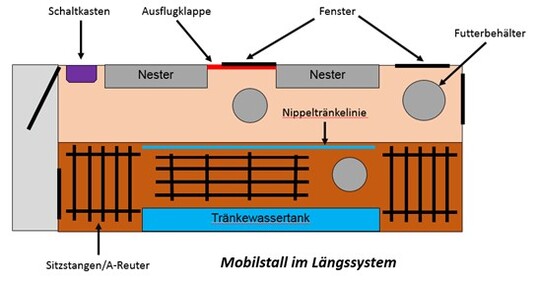 Vorteil dabei ist, dass die Stallhülle bereits vorhanden ist. Es empfehlen sich Kühlanhänger, da diese bereits isoliert sind. Die gängigen LKW-Kühlanhänger haben ein Innenmaß von etwa 7,30 m x 2,45 m = 17,8 m² und damit eine Kapazität von rund 105 Stallplätzen gemäß EU-Öko-Verordnung. Je nach Ausführung (Tandemachser oder Zweiachser mit Drehschemel) bietet sich zudem mit dem Bereich vor oder zwischen den Achsen eine Ausbaureserve von weiteren 7 bis 8 m², also 42 bis 48 Hennenplätzen. Diese zweite Ebene muss über Rampen mit der oberen Ebene verbunden werden und den Tieren ständig zugänglich sein, damit sie auf die Stallfläche angerechnet werden kann.