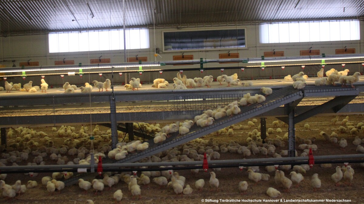 Auch für Masthühnerhalter wird die Frage zur Strukturierung des Stalls in Zukunft wichtiger. Erste Ergebnisse aus dem Projekt zeigen: Eine erhöhte Ebene mit Tränkelinie und Kotband wird gut von den Masthühnern angenommen – allerdings hauptsächlich tagsüber. Sie verbringen die Nacht lieber am Boden. Zu diesem Verhalten sind noch weitere Untersuchungen nötig.