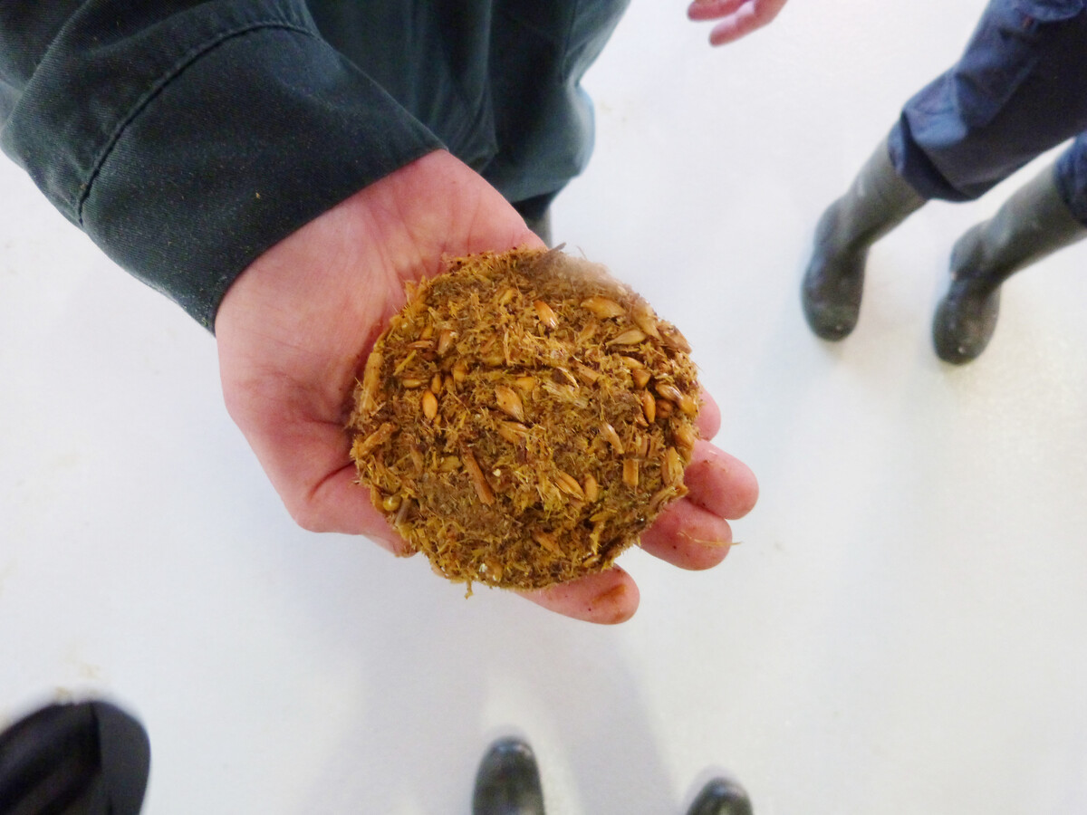 Ein Erlebnis hat sich Knösel besonders eingeprägt und ihre Überzeugung, dass Obsalim der richtige Weg für sie und ihre Herde ist, gefestigt. „In einem der vergangenen Sommer war es so trocken, dass wir auf der Weide nichts mehr zu fressen hatten“, erinnert sie sich. Um die Tiere ausreichend zu versorgen, nahm Knösel sie zurück in den Stall und fuhr viermal am Tag Ackerfutter ein. „Ich war eigentlich nur noch damit beschäftigt: Futter einholen, melken, füttern, noch zweimal Futter holen, melken, vorlegen. Den ganzen lieben langen Tag.“ Als dann Bruno Giboudeau zu Besuch auf dem Hofgut war, machten die beiden eine Obsalim-Diagnose. Dazu gehört – neben der bereits beschriebenen Erfassung von Symptomen – auch die Analyse des Kotpresskuchens. Denn der gibt letztlich Auskunft über die Futtereffizienz: Je dünner er ist, desto besser wird das Futter verwertet; ist er zu dick, wird das Futter schlecht verwertet. Mit einer Kotpresse sammelt man eine definierte Menge Kot ein und wäscht sie in einem Sieb mit definierter Lochgröße aus. Übrig bleibt ein fasriger Kotkuchen, dessen Höhe sich messen und vergleichen lässt. Man kann die Faserstruktur erkennen und die Menge der Fasern, die von den Pansenmikroorganismen nicht verwertet wurden. Daneben werden auch nicht verdaute Getreideanteile, ganze Körner oder Kornteile sichtbar.
